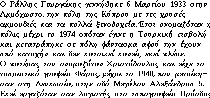 Rallis Georghakis was born on March 6th 1933 in Famagusta, a city on the island of Cyprus in the north-eastern corner of the Mediterranean Sea. This city was a very famous tourist resort with miles of golden beaches and hotels but in 1974 it became a ghost-town because of the Turkish invasion, and still is, up to the present day. His father, Christodoulos, used to be the proprietor of the "Faros Tourist Agency" up until the early forties when they moved to Nicosia (Megalou Alexandrou 5) and he became an accountant at the "Proodos Printing Office". The mother was Olympia , of the Santamas family, a very well known milliner (kapellou) who had the shop "Pimba's hats" during the forties and fifties in Nicosia. After the elementary education at Elenion and a couple of years at Pankyprion Gymnasion he attended the Pankyprion Emporikon Lykeion in Larnaca, where an uncle, Mr. Lysos Santamas ( a judge) was the mayor, and finally the American Academy. Certain school-mates during those years were among others, Michalakis Kolokassides, Ioulios Stavrinides, Christoforos Pattichis, Freddie Eleftheriades ( with whom they became the best of friends), Andreas Karydas, Andreas Antoniades, Lellos Markides, Andreas Lambrou, Elias Ipsarides and for a long time friend Armand Josephin (a famous artist/musician/poet), with whom they came a long way together in the Art world. |