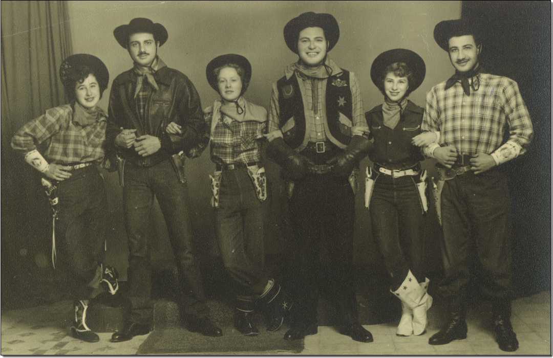 The "cowboys" from the days of wine and roses(Bal-Maske at Ledra-Palace Hotel (1952). L-to-R: Lilliana & Kikis Hadjikyriakos, "Rustie", Freddie Eleftheriades, Dolly Straftis and myself. |