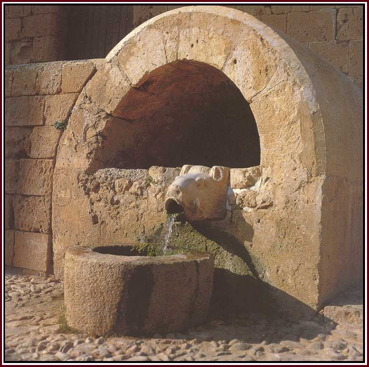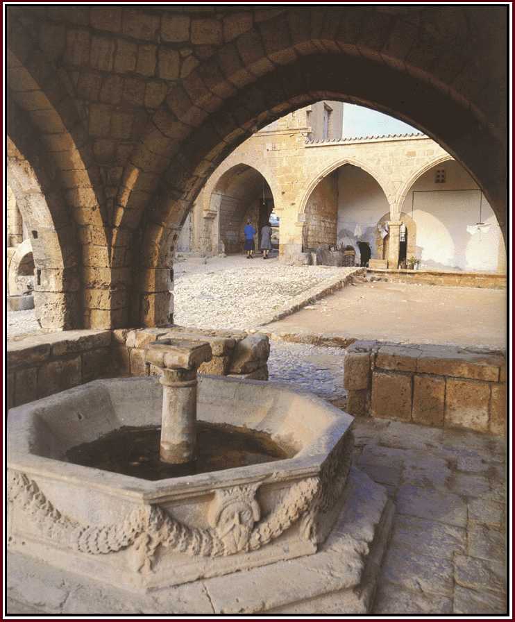 ...In the middle of the courtyard is a fountain of spring-water , built up as we might build one , and not badly , of marble . Over this at no great height they have placed a dome on four pillars , with raised seats or platforms of Eastern fashion right round it , a cool and shady resting place . Here we settled down , ate there by day and slept at night , when the murmur of the water was particularly pleasant .' |