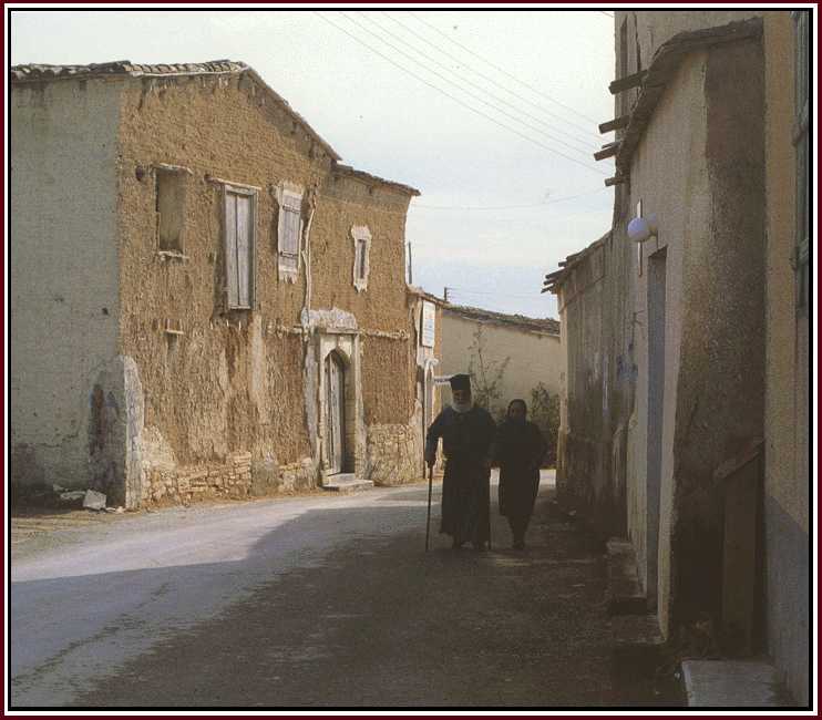 In our living room hung two tall paintings by the late George Pol. Georghiou of a 'papas' and a 'papathkia' (a village priest and his wife) . At Kalochorio Georghiou's subjects were suddenly animated against a real Cypriot village backdrop .