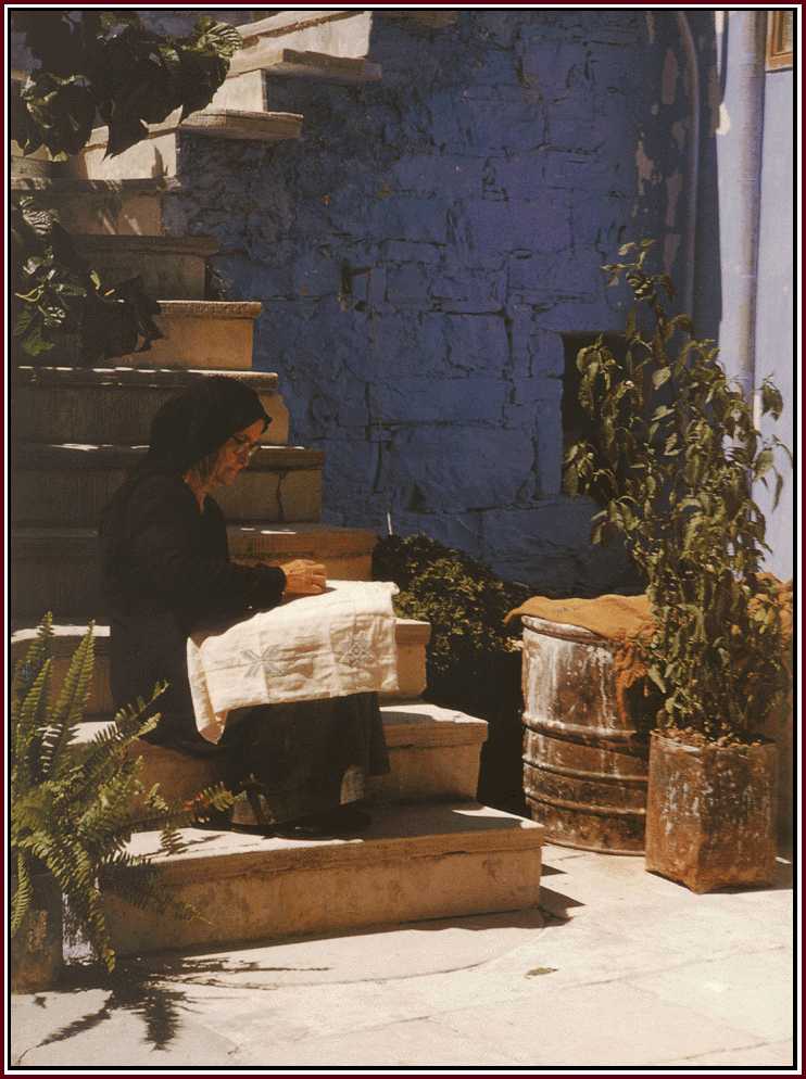 It was the practice for village-folk to whitewash their houses for Easter. At Lefkara and Kato Dhrys it was a case of a 'bluewash' rather than a whitewash. Whatever the reason or tradition, the blue courtyards and seasonal plants and flowers have a rare beauty. |