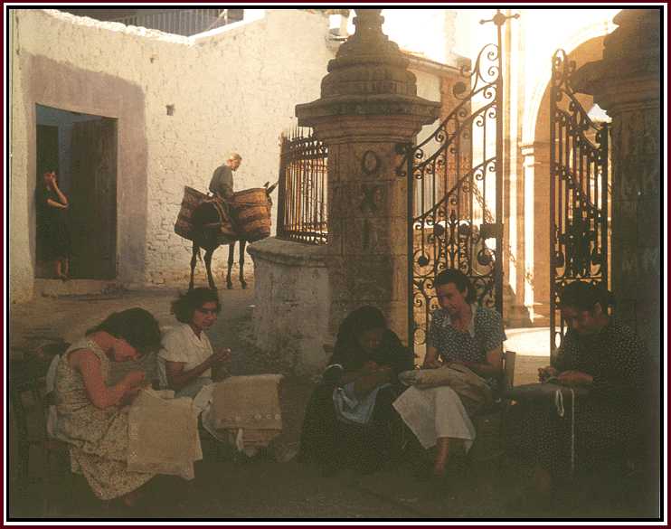 Hard-working Lefkaritisses produce lace outside the gates and in the shadow of the church of the Holy Cross whilst life goes by perhaps slowly on a donkey.