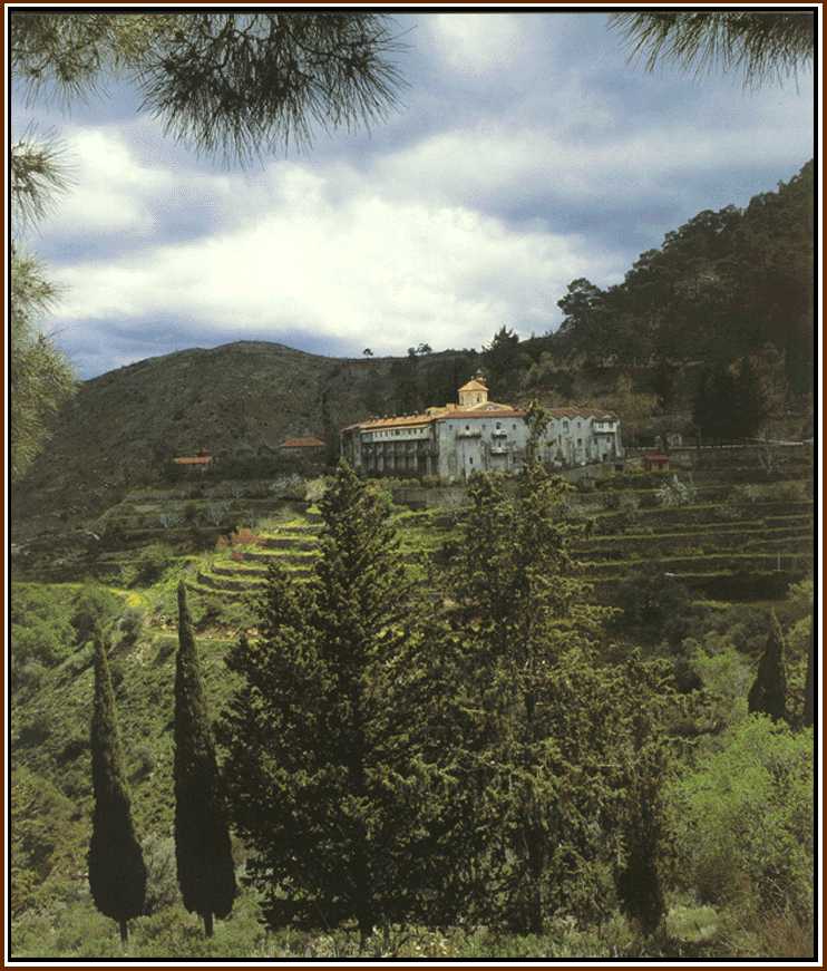The Monastery of Makheras, on the northern slopes of Mt. Kionia, was founded c. 1148 with the help of a grant from the Emperor Manuel Comnenus. It was burnt down in 1530 and 1892, and rebuilt in 1900. Colourful legends as to the origins of monasteries in Cyprus abound. Makheras, it is said, owes its name to makheri Greek for knife or sword in allusion to the sharp icy winds that blow down the valley or the sword that the hermits Ignatios and Prokopios found alongside the miracle-working icon of the Blessed Virgin Mary. |