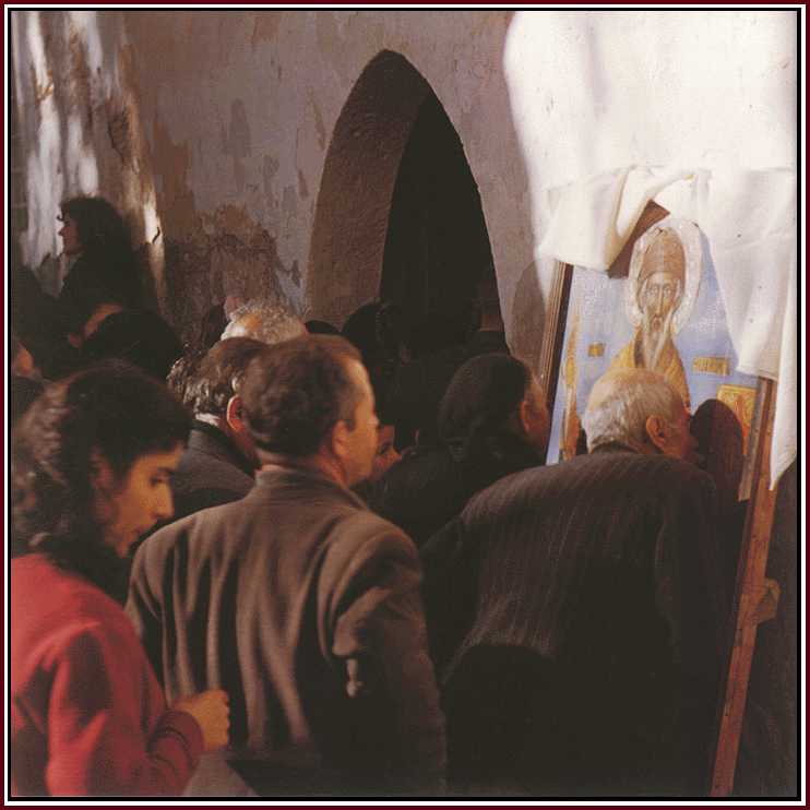 The late George Pol. Georghiou, the island's internationally known painter, had a special affection for St. Spyridon, the local shepherd boy who became a bishop and who gained great fame for his eloquence and patronage of the deaf and the paralytic. Georghiou painted his great picture of the saint reclining and resting with his boots off in allusion to St. Spyridon's ability to walk over immense distances in ministering to his flock. |